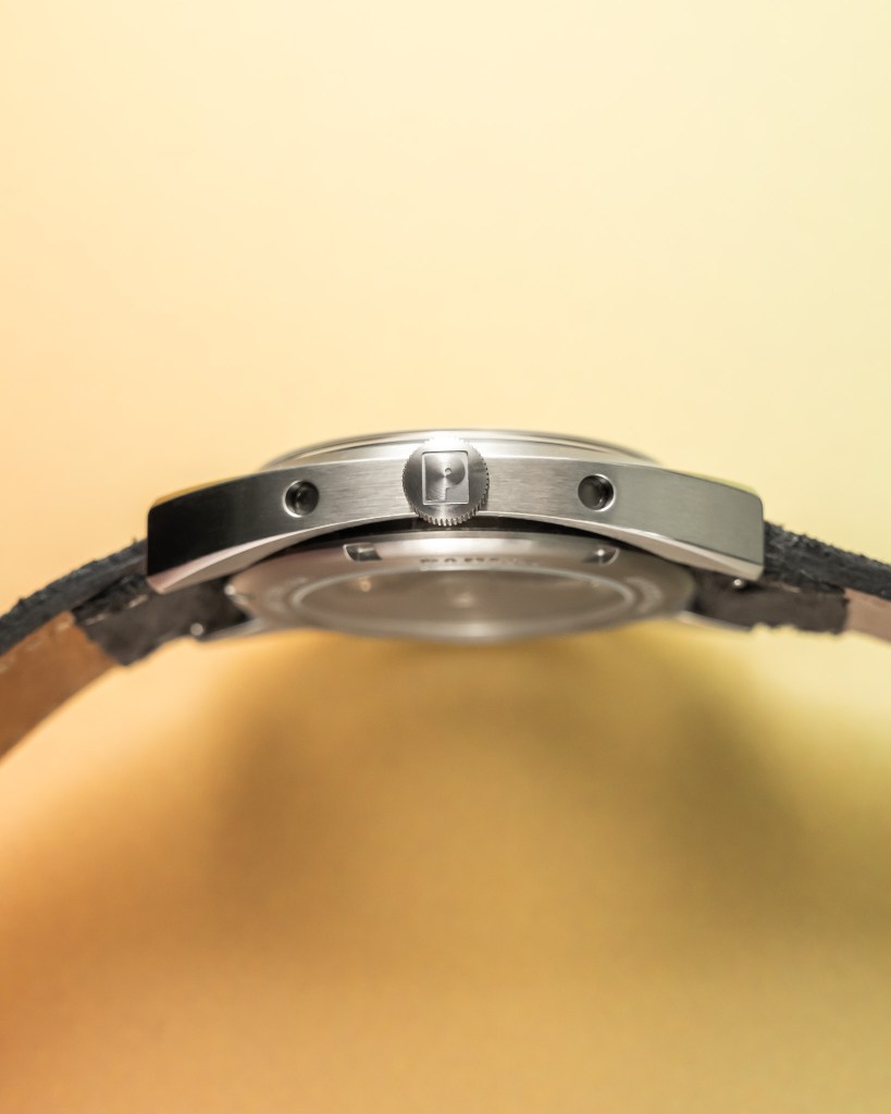 Priced at £900, one might expect a sapphire crystal instead of hesalite. Indeed, the 35mm models have the option of either hesalite or sapphire. Personally, I’m indifferent. I get the vintage vibes that hesalite gives, although I appreciate some folks might want the robustness of sapphire. Speedmaster Moonwatch anyone? Is buffing that crystal with Polywatch now and then such a bad thing? Perhaps too much of an inconvenience for some.
