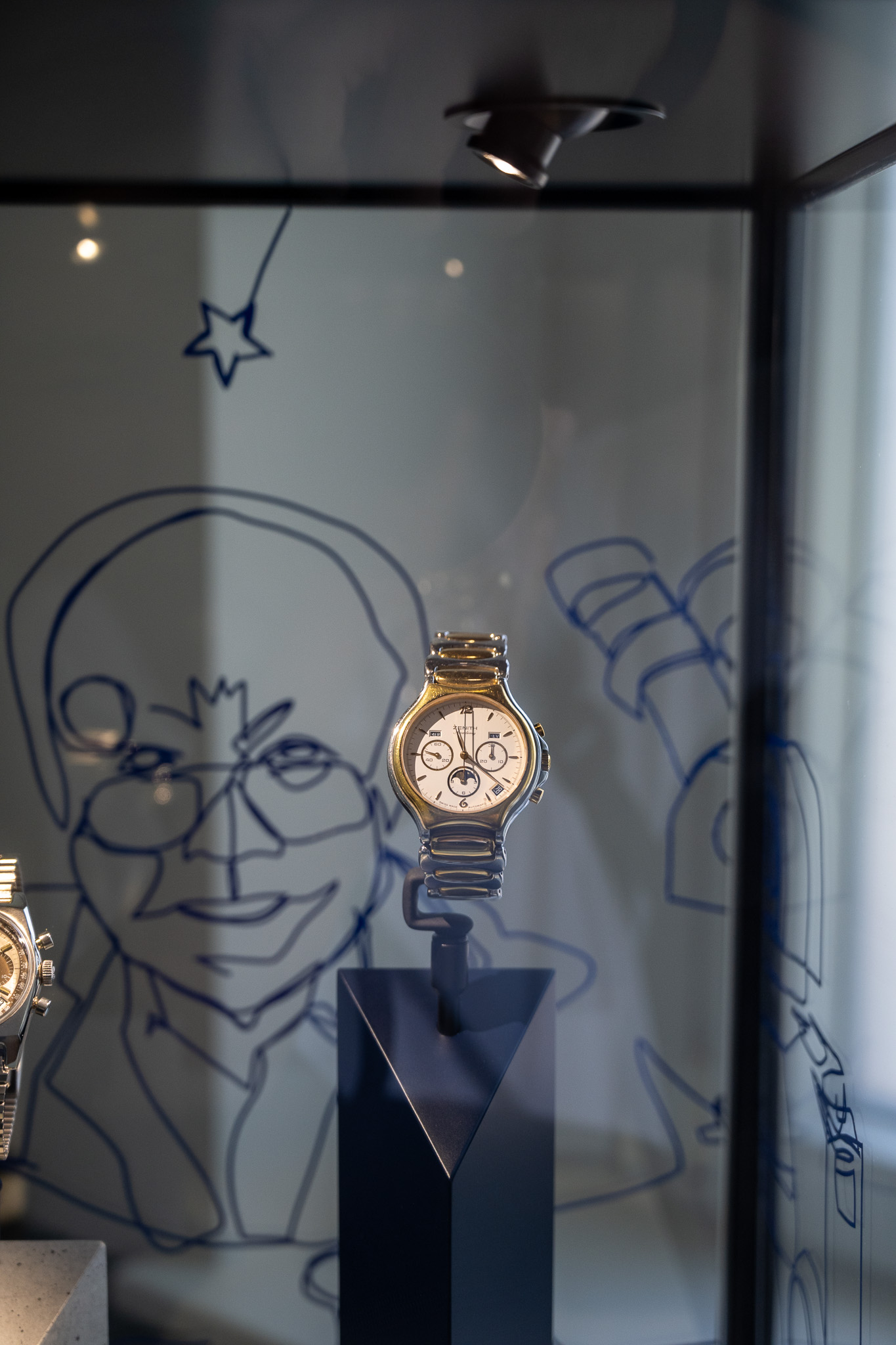 His desk with plans, a stamp and a photograph of his, presumably taken at Martel, welcomes you before heading up the stairs towards the grenier. Also on show is his daily wear, a Zenith Chronomaster A384 alongside the watch that was given to him by Zenith, an Academy Triple Calendar, in recognition for his pivotal role in reviving the El Primero in the 80s.